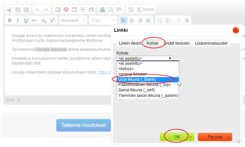 6. Valitse alasvetovalikosta "Uusi ikkuna (_blank), tällöin linkki saadaan aukeamaan uuteen välilehteen